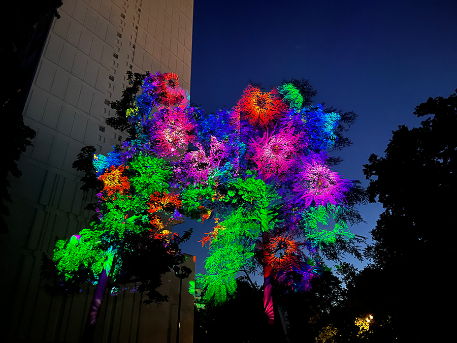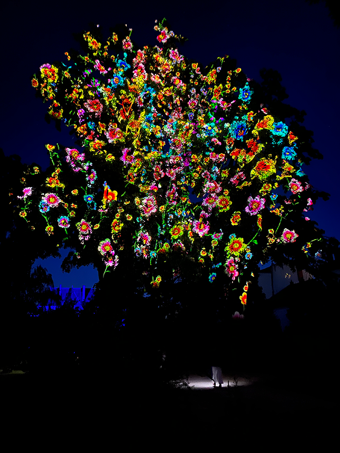 Le spectacle se prolonge jusque dans les feuillages du jardin, plongeant le visiteur dans une immersion totale.